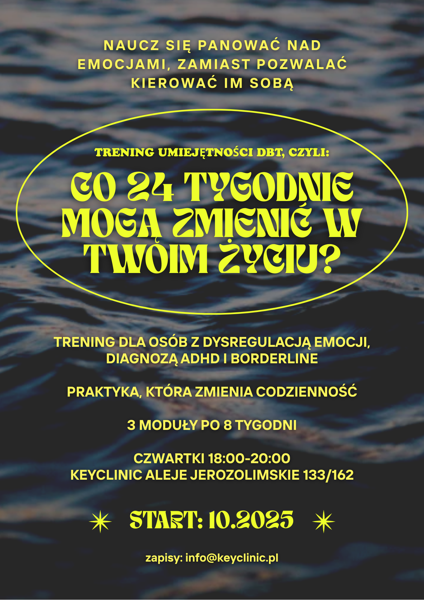 Trening Umiejętności DBT w KeyClinic został stworzony właśnie dla osób, które chcą lepiej radzić sobie z emocjami, wprowadzić do swojego życia więcej równowagi i zbudować zdrowsze relacje.